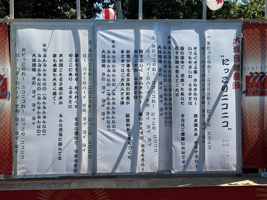 ▲ステージに掲げられた「大塚団地音頭」の歌詞。祭りの空気を彩る大切な言葉です。