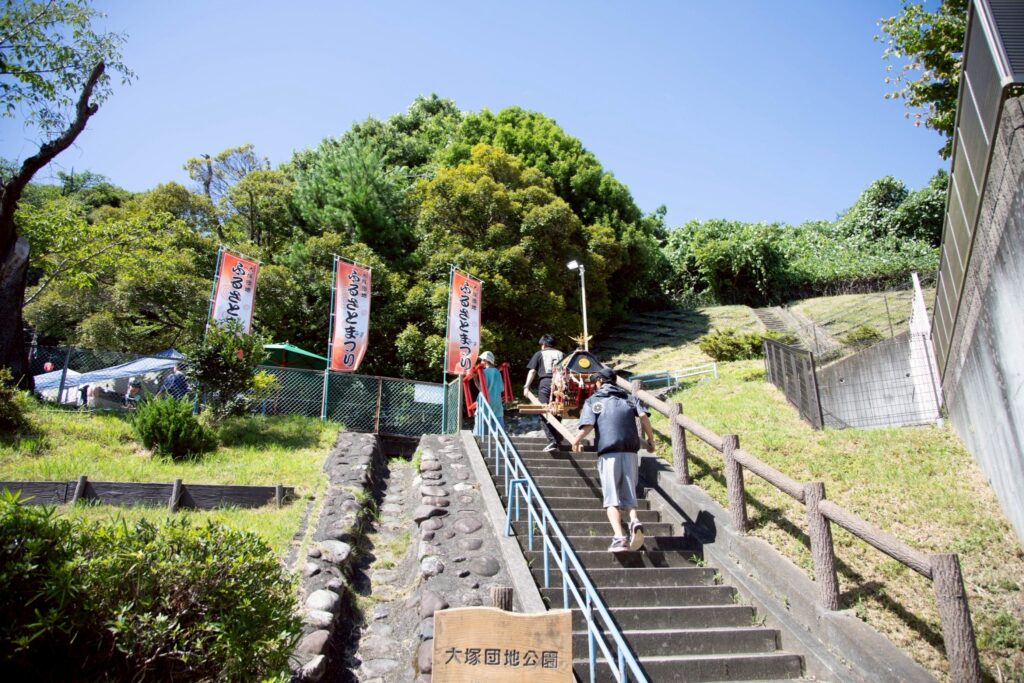 ▲公園の階段を、大人たちが神輿を担いで上がります。団地の坂とともにあるお祭りです。