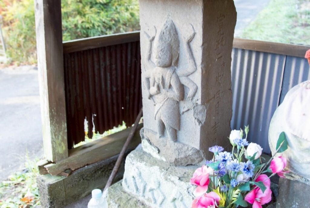 刻まれたのは、六本の腕をもつ青面金剛の姿です。